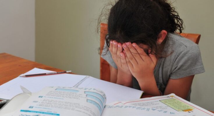 Criança esconde o rosto nas mãos. Na frente dela, em cima da mesa, há livros e cadernos