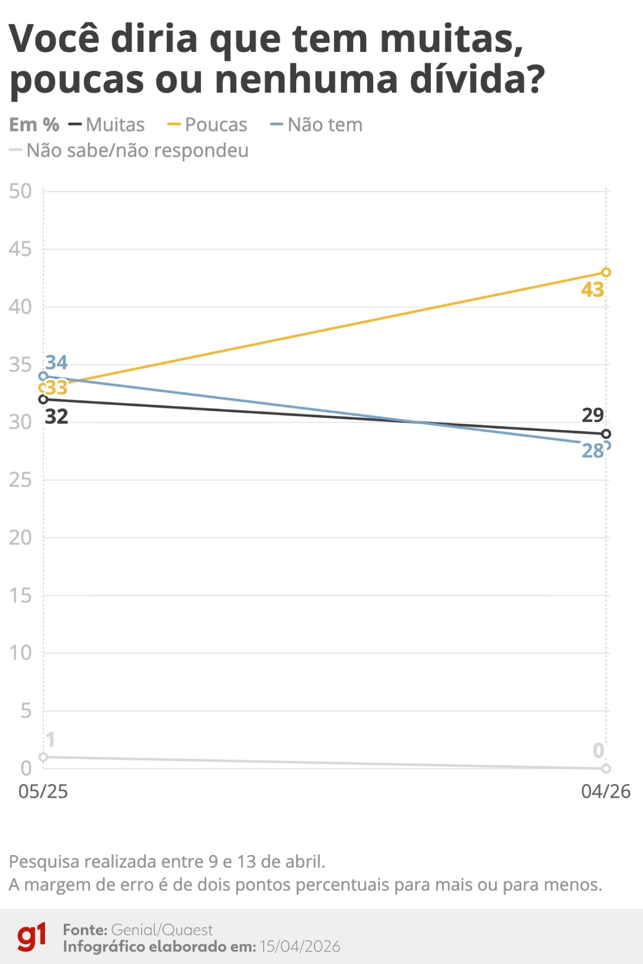 🔍 O levantamento foi encomendado pela Genial Investimentos e ouviu 2.004 pessoas com 16 anos ou mais entre os dias 9 e 13 de abril. A margem de erro é de dois pontos percentuais para mais ou para menos, e o nível de confiança é de 95%. O registro da pesquisa no TSE é BR-09285/2026.