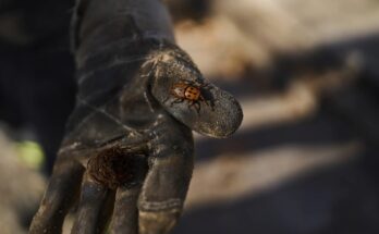 Um jardineiro enluvado segura um gorgulho-vermelho-das-palmeiras e seu casulo encontrados durante a poda de uma árvore em um jardim particular em Montevidéu, Uruguai AP/Matilde Campodonico No Uruguai, as palmeiras estão …