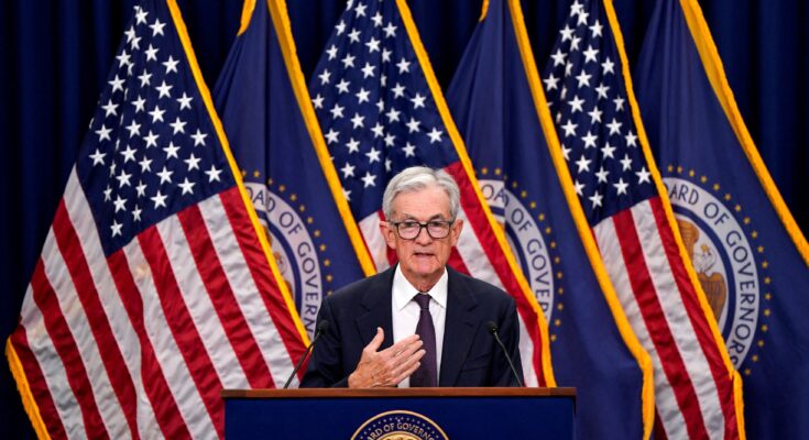 Jerome Powell durante uma coletiva de imprensa após decisão sobre taxas de juros, em 17 de setembro de 2025.
