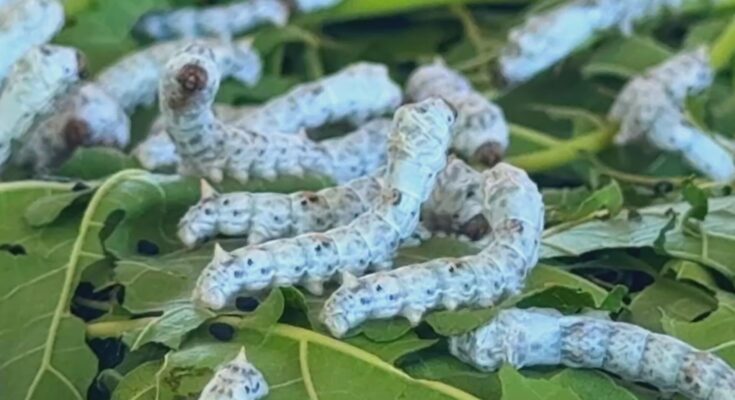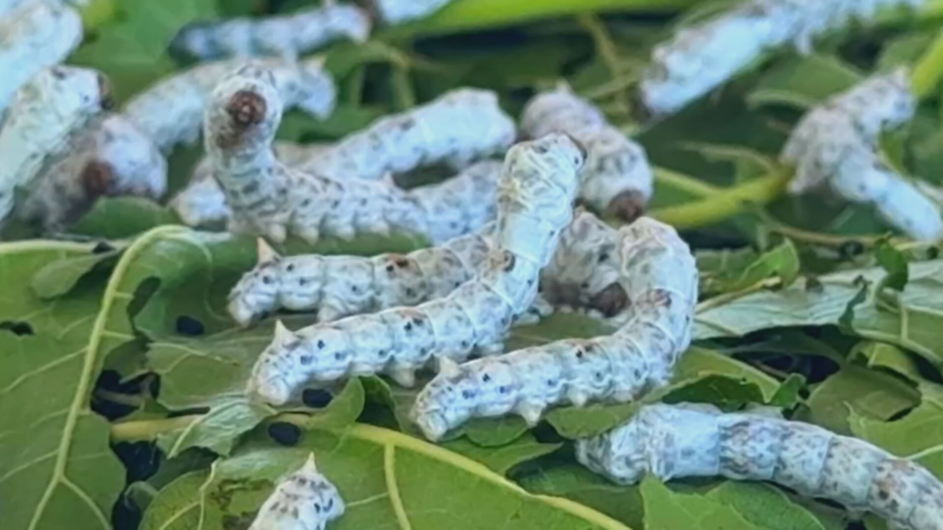 No galpão da propriedade, as lagartas permanecem por cerca de duas semanas. Depois do período, elas sobem em direção aos bosques, que ajudam a padronizar os casulos e onde cada uma vai produzir um fio.