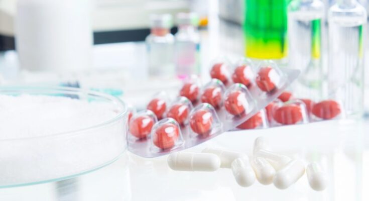 Cartelas de comprimidos vermelhos e azuis e tubos de ensaio em cima de uma mesa branca