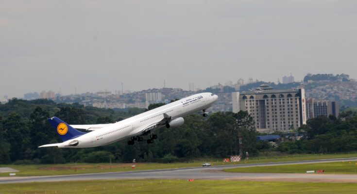 Avião decolando da pista do Aeroporto Internacional de Cumbica