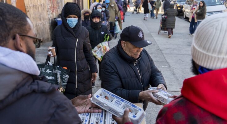 Pessoas fazem fila para distribuição de ovos em Nova York diante de escassez e alto preço do produto em supermercados dos EUA, em 21 de março de 2025.