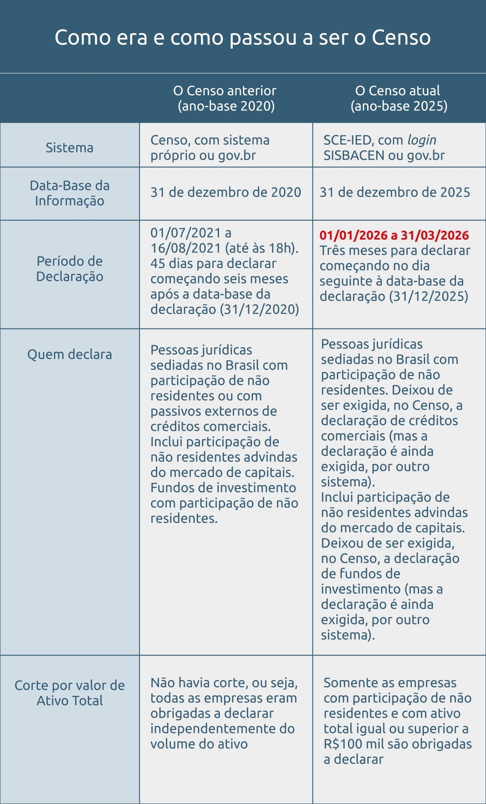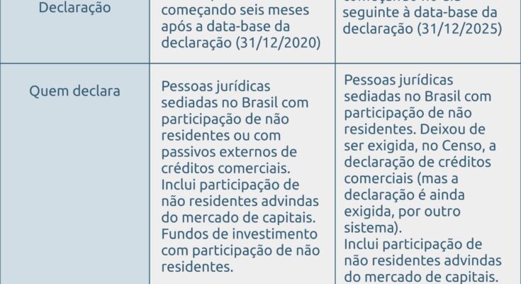 Confira no quadro abaixo como ficou a atual declaração do Censo de Capitais Estrangeiros na comparação com a última declaração quinquenal, cujo ano-base foi 2020.