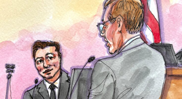 Elon Musk é interrogado por seu advogado Steven Molo durante o processo de Musk sobre a conversão da OpenAI para lucro em um tribunal federal em Oakland, Califórnia, EUA, em 28 de abril de 2026, em um retrato no tribunal.