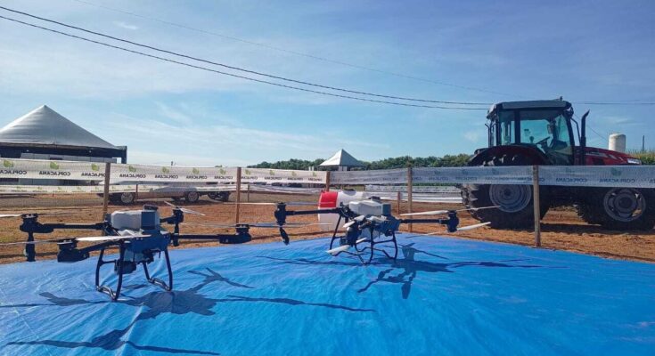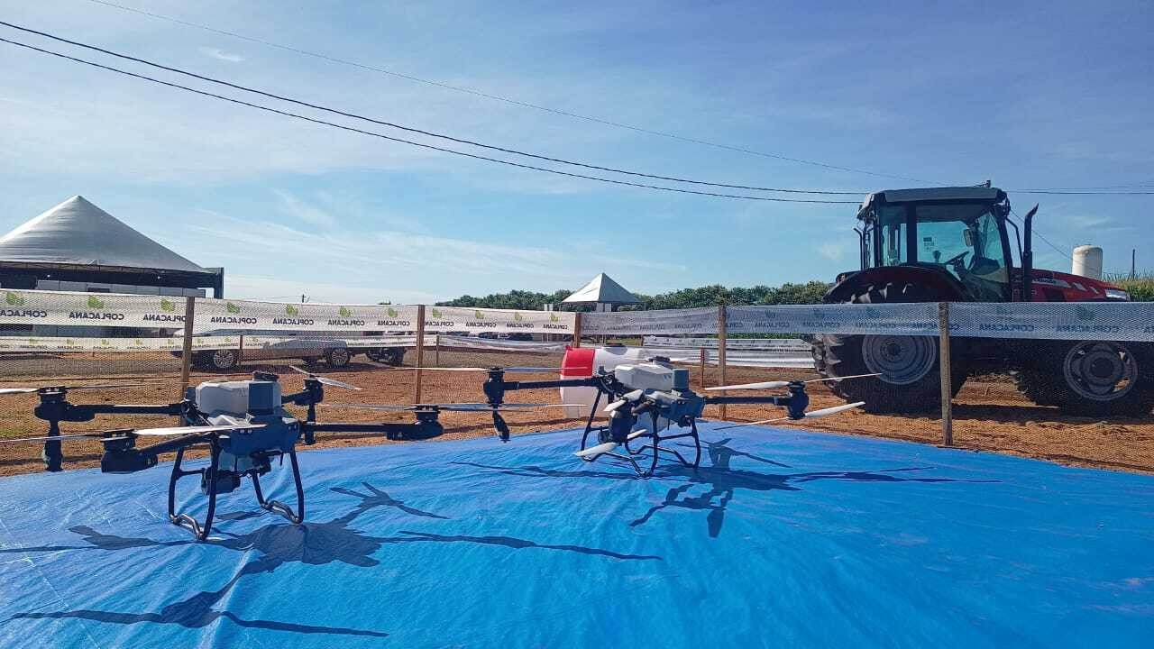 Outro destaque da feira foi um drone que pode ser utilizado para a aplicação de insumos agrícolas. A máquina conta com um motor reforçado e levanta voo com até 100 kg de insumos. Essa utilização pode reduzir as perdas na pulverização de defensivos em lavouras de grãos e agilizar o plantio de pastagens.
