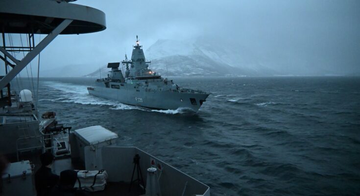 Navio de guerra da Otan navega durante treinamento militar no Ártico em janeiro de 2025.