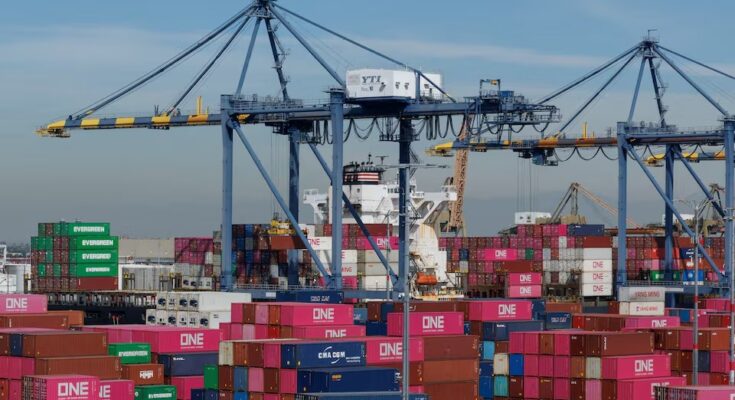Contêineres de carga empilhados na Terminal Island, no porto de Los Angeles, Califórnia, EUA, em 24 de fevereiro de 2026