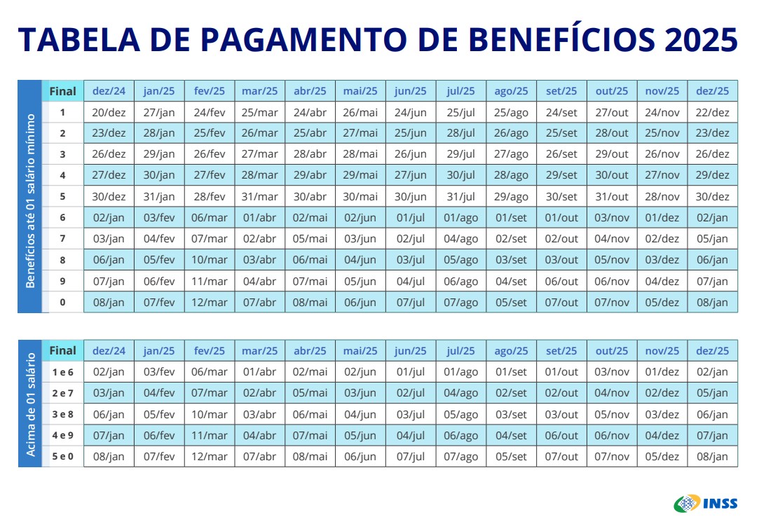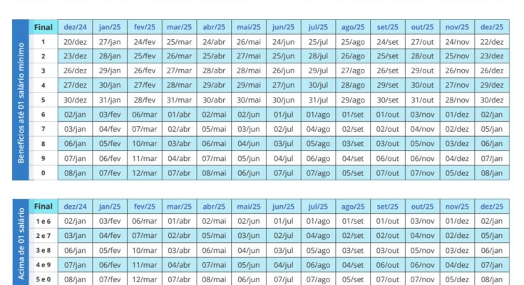 O calendário leva em conta o número final do cartão de benefício, sem considerar o último dígito verificador, que aparece depois do traço. Para quem recebe o piso nacional, os depósitos referentes a janeiro vão começar no dia 27 de janeiro.