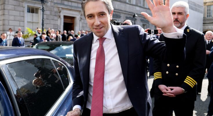 Simon Harris acena para apoiadores ao sair da sede do Parlamento irlandês