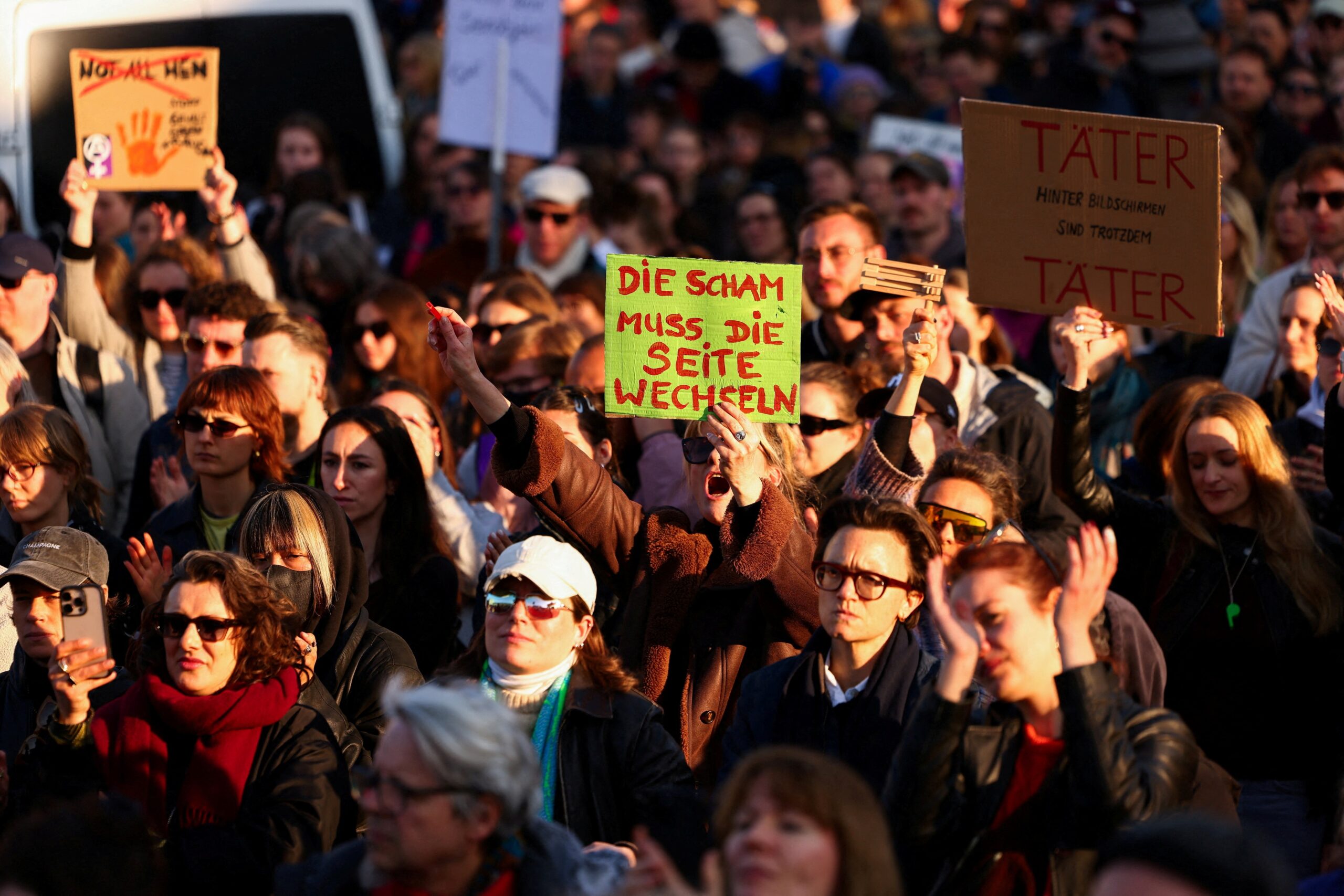 Pessoas protestam contra a violência sexual e em apoio à atriz Collien Fernandes, em Berlim.