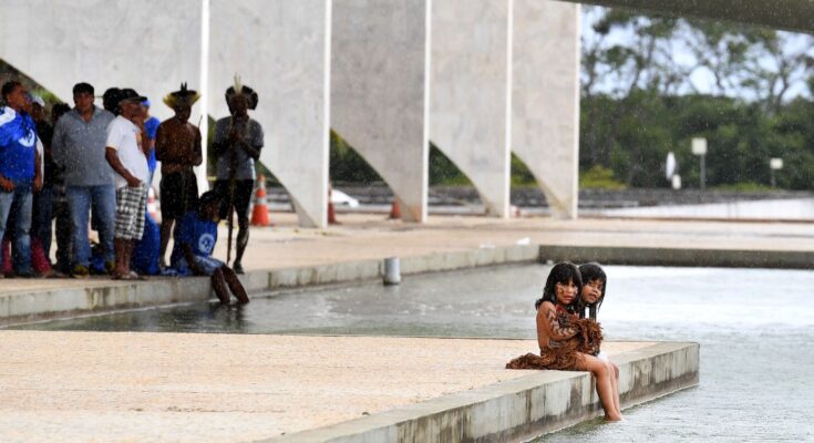 Crianças indígenas molham os pés no espelho d’água do Palácio do Planalto, em Brasília, em imagem de 2016