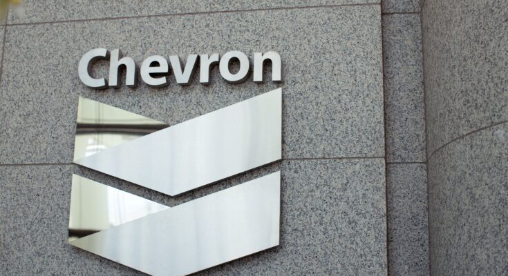 Logotipo da Chevron no edifício da empresa em Houston, Texas.