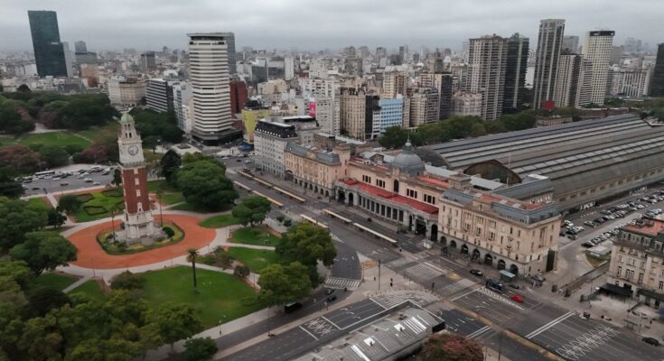 Drone mostra o entorno da estação de trem Retiro, em Buenos Aires, vazia em 19 de fevereiro de 2026, dia de paralisação geral na Argentina em protesto contra o projeto de reforma trabalhista do presidente Javier Milei