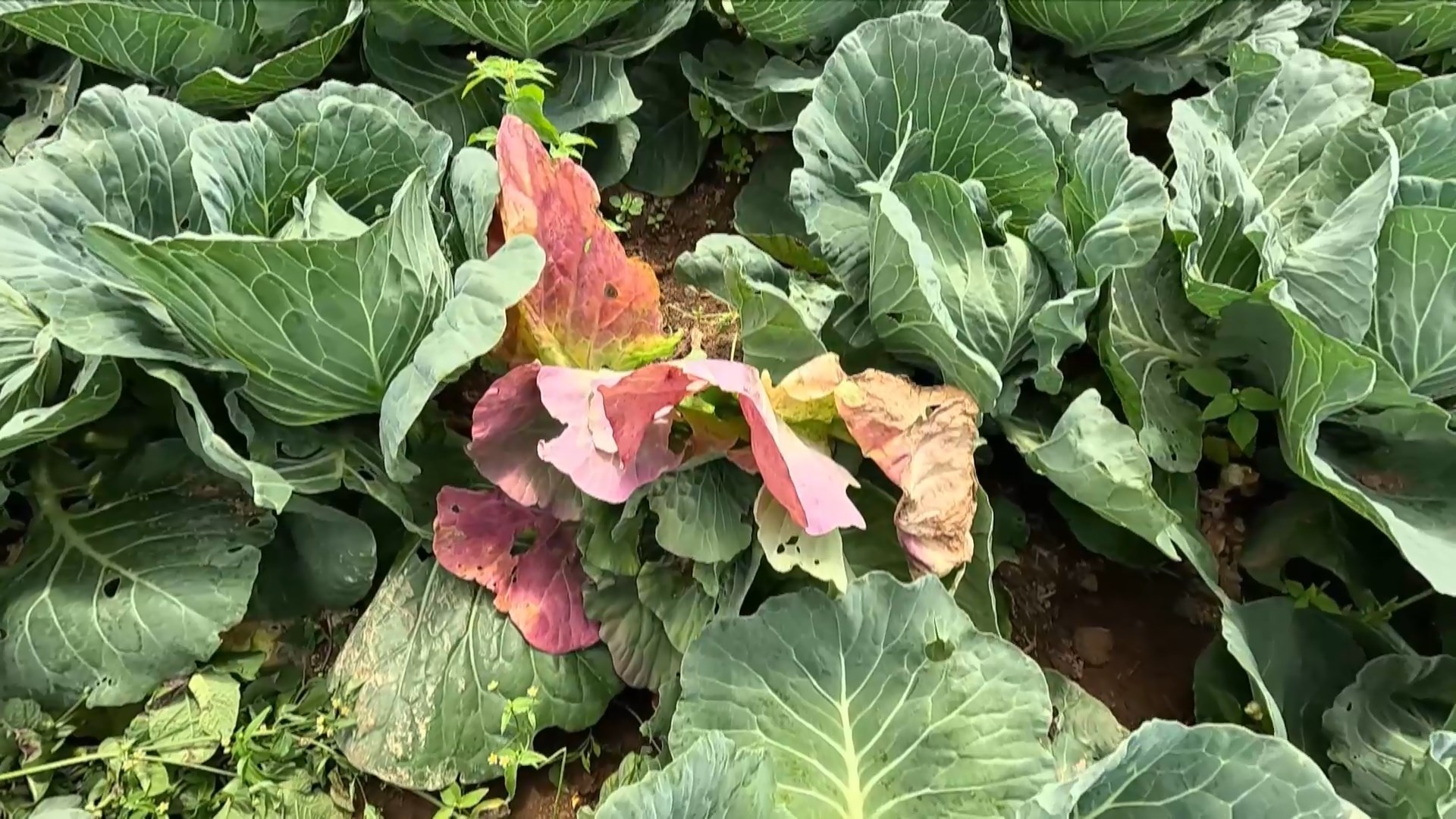 Além do clima, uma doença afetou a lavoura: o vermelhão, também conhecido como enfezamento do repolho, causado por bactérias que penetram na hortaliça.