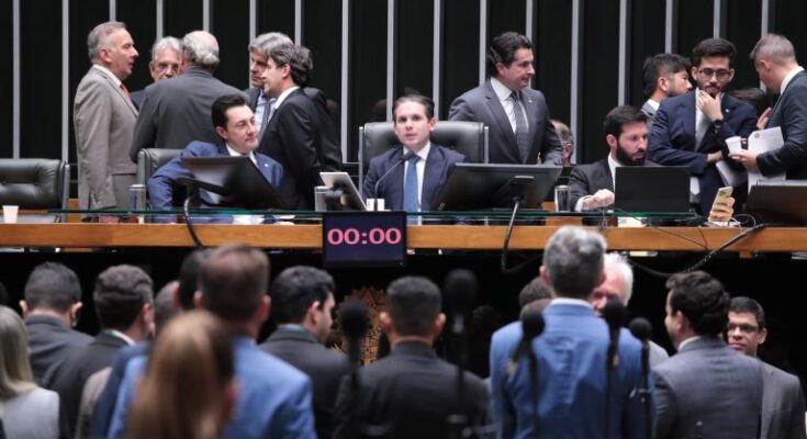 Presidente da Câmara, Hugo Motta (C), comanda a sessão do Plenário que aprovou o texto