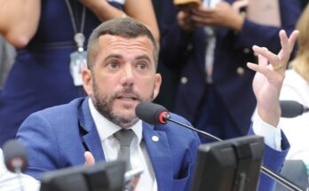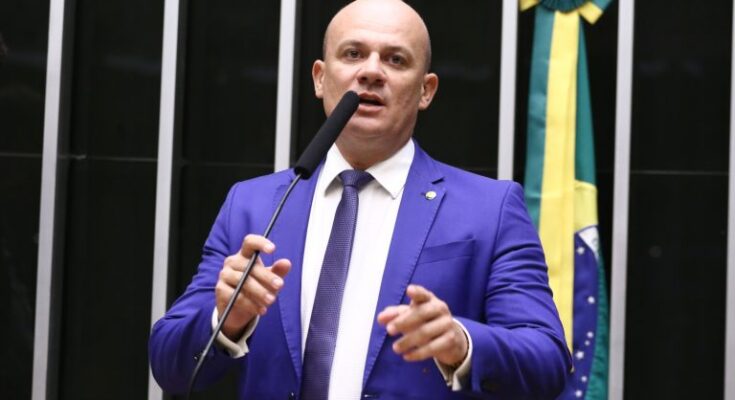 Deputado Cabo Gilberto Silva fala ao microfone. Ele é um homem claro, calvo, usa terno azul marinho e camisa branca. Ao fundo, no lado direito, há uma bandeira do Brasil