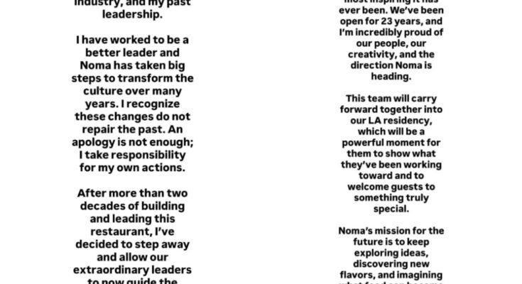 “Tenho trabalhado para ser um líder melhor e o Noma deu grandes passos para transformar sua cultura ao longo de muitos anos. Reconheço que essas mudanças não reparam o passado. Um pedido de desculpas não é suficiente; assumo a responsabilidade por minhas próprias ações”, diz a nota.