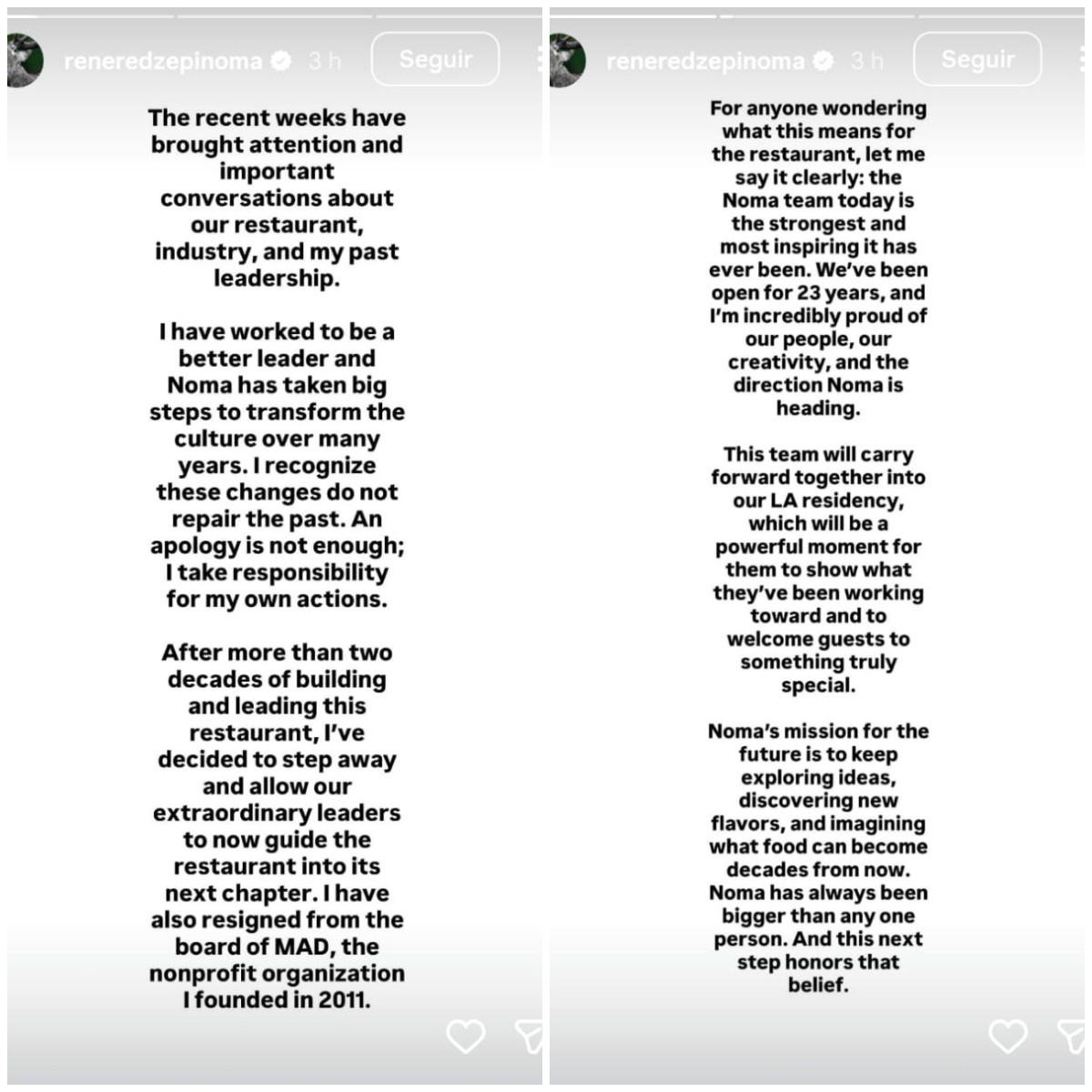 Em seu perfil no Instagram, Redzepi publicou uma nota afirmando que assume responsabilidade pelas ações e pediu desculpas. (leia a nota na íntegra ao final da matéria)
