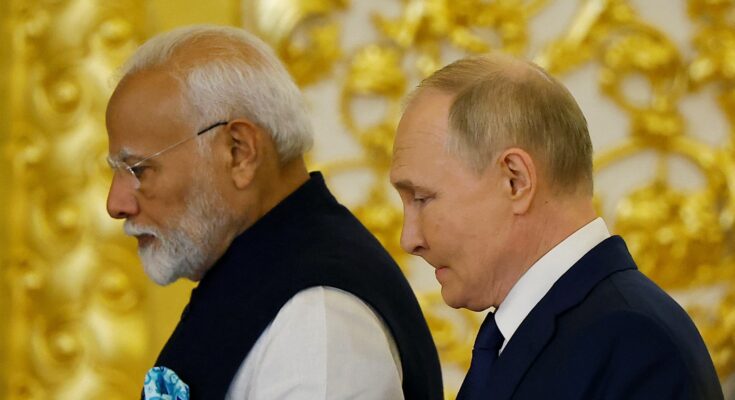 Os presidentes da Índia, Narendra Modi (à esq.), e da Rússia, Vladimir Putin, durante encontro em Moscou em 2024.