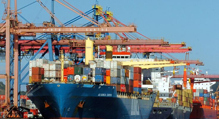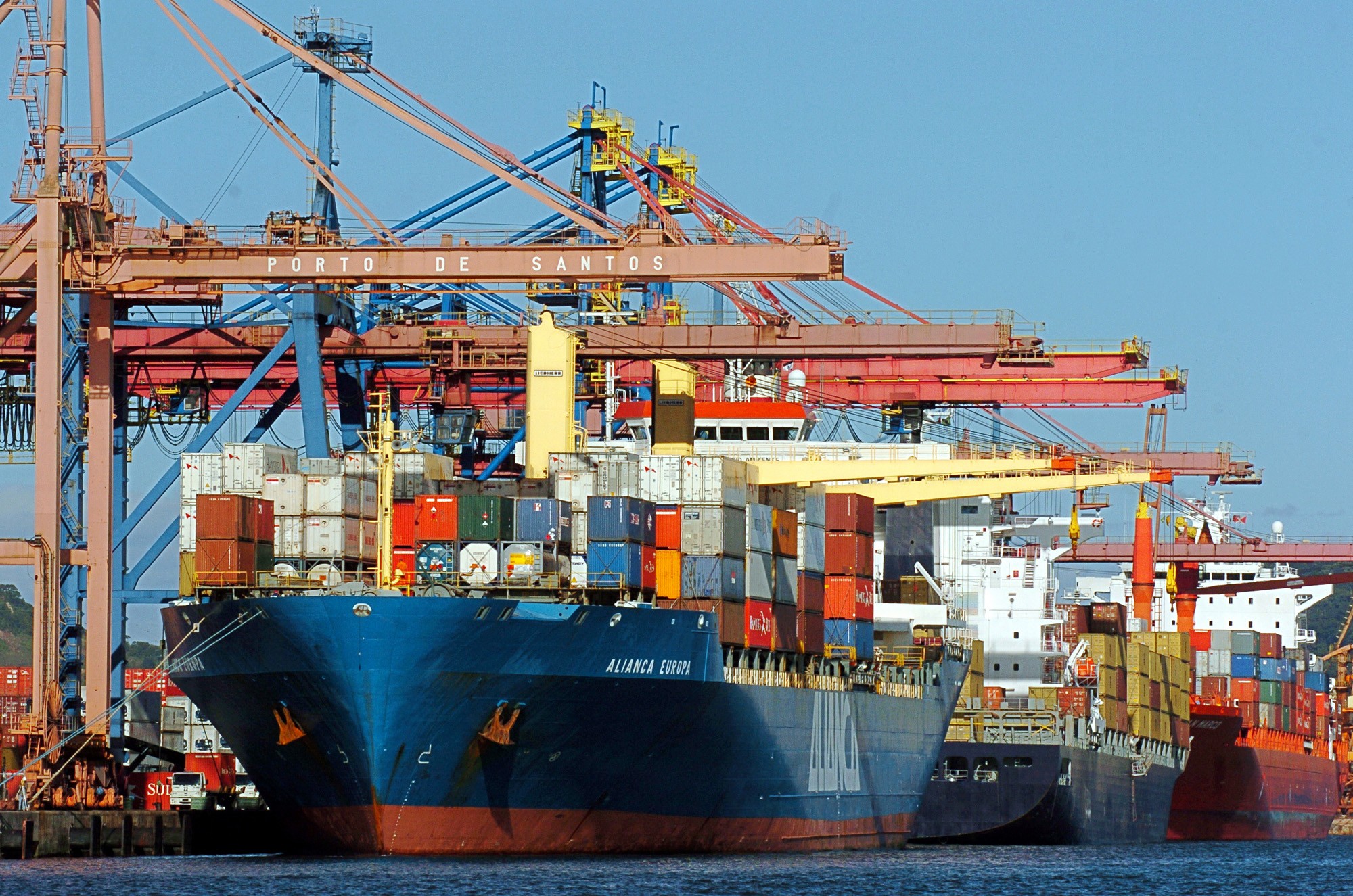 Navios porta-contêineres são vistos no porto de Santos.