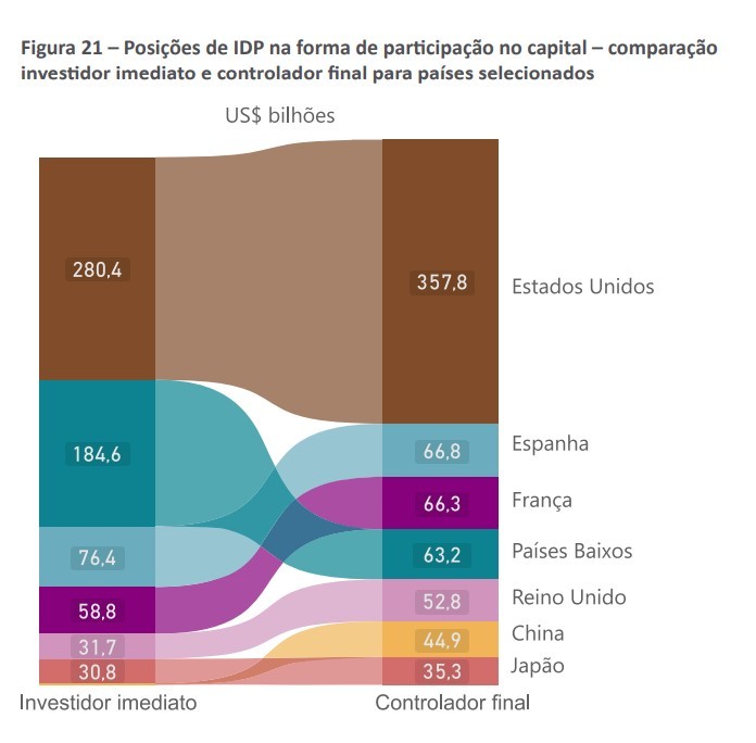 A liderança dos EUA ocorre tanto no conceito de “investidor imediato” (domicílio da empresa não residente que investiu diretamente na subsidiária ou filial) quanto no de “controlador final” (residência do investidor que detém o efetivo controle e interesse econômico na empresa investida no Brasil).