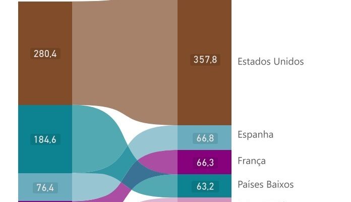 A liderança dos EUA ocorre tanto no conceito de “investidor imediato” (domicílio da empresa não residente que investiu diretamente na subsidiária ou filial) quanto no de “controlador final” (residência do investidor que detém o efetivo controle e interesse econômico na empresa investida no Brasil).