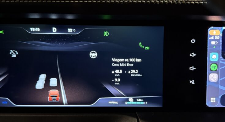 Nesse cenário, que favorece o motor elétrico e mantém o motor a combustão desligado, o consumo ultrapassou 40 km/l e chegou a 48,5 km/l — consumo que se esperaria de uma moto Honda CG 160, não de um carro com aerodinâmica e peso de pouco mais de duas toneladas.