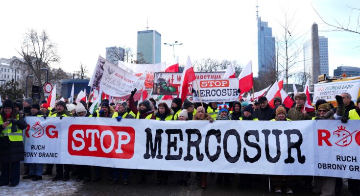 Agricultores da Polônia protestam contra acordo entre União Europeia e Mercosul em 9 de janeiro de 2026